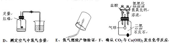 (5分)下列A ~ F是初中化學(xué)中的六個實驗裝置,請按要求填空: