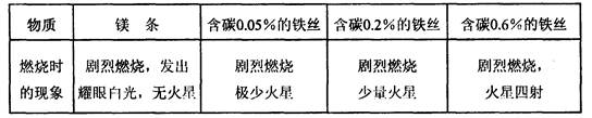 (6)小明對鐵絲在氧氣中燃燒為什么會火星四射進(jìn)行探究。下表是他將純鎂條和不同含碳量的鐵絲(鎂條和鐵絲起碼均為0.4mm)放入氧氣中燃燒時的實驗現(xiàn)象的記錄。![]()