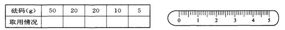 用托盤天平稱量一未知質(zhì)量的燒杯,F(xiàn)用“↓”表示向托盤上增加砝碼,用“↑”表示從托盤上減少砝碼.請用“↑”和“↓”在下表中表示你的稱量過程,并在下圖中用“I”表示游碼在標(biāo)尺上的位置(若燒杯的實際質(zhì)量為36.8g)。![]()