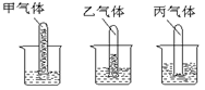把盛有甲、乙、丙三種氣體的試管分別同時(shí)倒插入盛有水的燒杯中,一段時(shí)間后,觀察到如圖所示的現(xiàn)象,對(duì)甲、乙、丙氣體的分析正確的是: ![]()