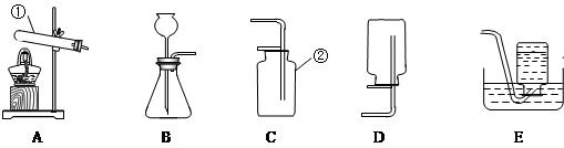 ②實驗室用過氧化氫溶液與二氧化錳混合制取氧氣的化學(xué)方程式為 ,所選用的發(fā)生裝置是 (填序號),用E裝置收集氧氣,判斷氧氣已集滿的現(xiàn)象是 。