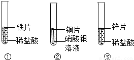 (2010?青島)某化學(xué)興趣小組為探究鐵、銅、鋅、銀的金屬活動性順序,設(shè)計了下圖所示的三個實驗(其中金屬均已打磨,且形狀、大小相同;所用鹽酸的溶質(zhì)質(zhì)量分?jǐn)?shù)、用量也相同).下列判斷中,錯誤的是( )