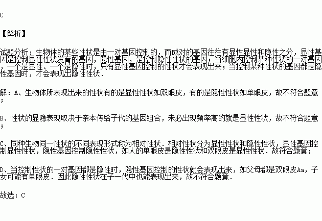 下列關(guān)于顯性性狀和隱形性狀的描述,正確的是( )