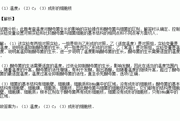 溫度、水分、有機(jī)物等因素均可影響酵母菌的生長(zhǎng)、繁殖,某研究性學(xué)習(xí)小組的同學(xué)為了探究溫度對(duì)酵母菌生長(zhǎng)的影響,他們將蒸熟冷卻的糯米與酒曲攪伴后,分成三等份分別裝入甲、乙、丙三個(gè)廣口瓶中,放在不同的溫度環(huán)境中發(fā)酵,其實(shí)驗(yàn)結(jié)果如下表: