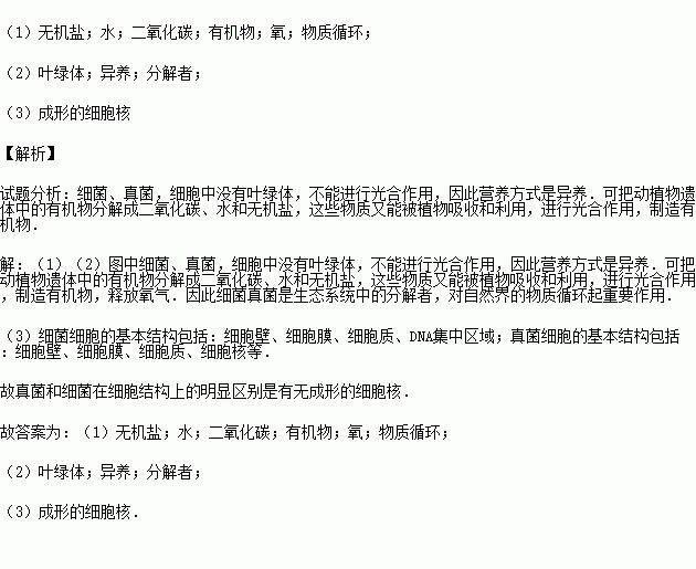 (1)細菌和真菌能將動植物的遺體分解成 、 和② ,這些物質又被植物吸收和利用,進而制造出儲存能量的 .并且釋放出③ ,可見,細菌和真菌對自然界的 起重要作用.