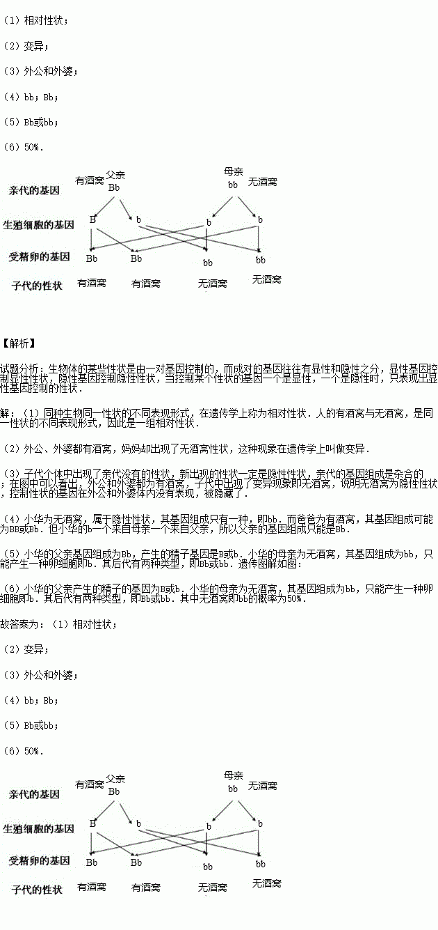 (5)如果小華有親兄弟姐妹則控制他們酒窩性狀的基因組成可能是 .