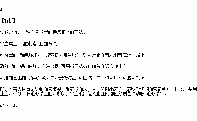 某人因事故導致血管破裂,鮮紅的血從血管里噴射出來,則出血的部位及止血的部位分別是( )