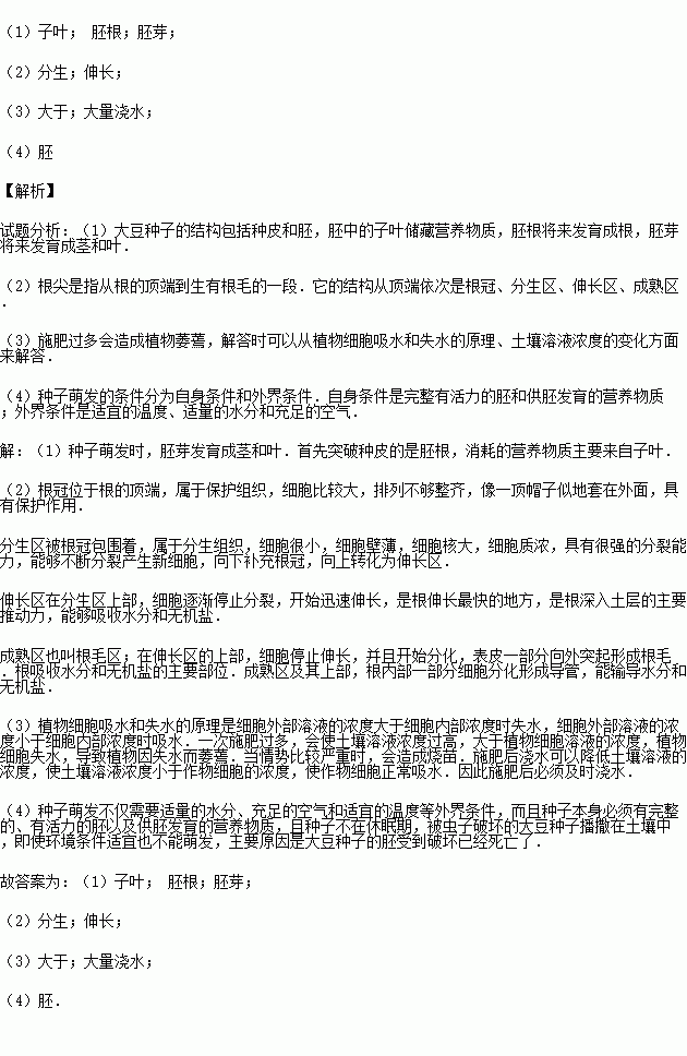 (1)大豆種子在萌發(fā)過程中,所需要的營養(yǎng)物質(zhì)來自種子中的 ;種子的胚在吸收營養(yǎng)物質(zhì)后, 首先突破種皮發(fā)育成根,將來能發(fā)育成莖和葉的結(jié)構(gòu)是 .