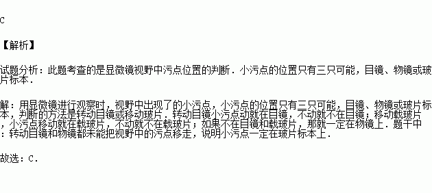 用顯微鏡觀察時(shí),如果轉(zhuǎn)動(dòng)目鏡和物鏡都未能把視野中的污點(diǎn)移走,那么可以斷定污點(diǎn)在( )