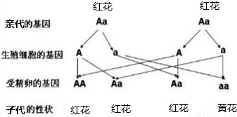 (2)若紅花(A)對(duì)黃花(a)是顯性,則后代黃花煙草的基因組成是aa,子代中控制黃花的基因aa一個(gè)a來(lái)自父方,一個(gè)來(lái)a自母方;說(shuō)明親代紅花中含有一個(gè)控制紅花的基因A外,還含有一個(gè)控制黃花的基因a,即親代紅花的基因組成是Aa.后代紅花的基因組成為AA或Aa.遺傳圖解如圖所示: