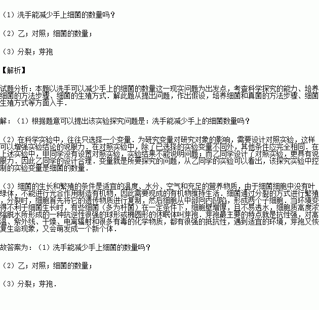 (3)細(xì)菌在適宜的溫度、營養(yǎng)物質(zhì)充分時,進行旺盛的 生殖.遇到惡劣環(huán)境,細(xì)菌形成圓形或橢圓形的休眠體 .