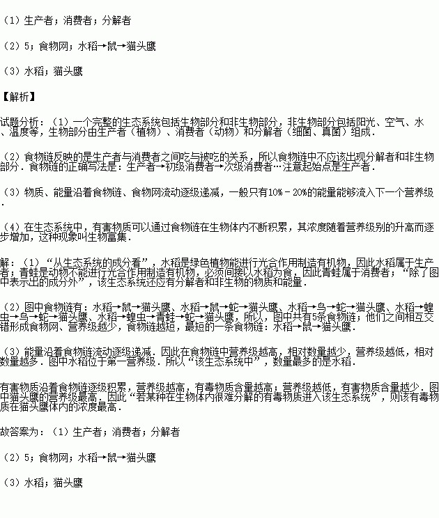 (1)從生態(tài)系統(tǒng)的成分看,水稻屬于 ,青蛙屬于 .除了圖中表示出的成分外,該生態(tài)系統(tǒng)還應(yīng)有 、和非生物的物質(zhì)和能量.