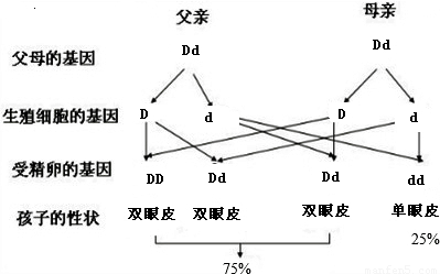 查看答案和解析>> 科目:初中生物 來源: 題型: (1)請在圖圓圈內(nèi)填入相關的基因型. (2)父親的眼皮性狀是 雙眼皮 雙眼皮 ,母親的眼皮性狀是單眼皮 單眼皮 .(3)父親的生殖細胞是由 B B 產(chǎn)生的.A.卵巢 B.睪丸 C.附睪 D.輸精管 (4)如果該對夫婦已經(jīng)生了一個雙眼皮的孩子,那么,當他們生第二胎時,再生出一個雙眼皮的孩子的概率是 50% 50% .查看答案和解析>> 科目:初中生物 來源: 題型: (2012?淮安一模)人的雙眼皮由顯性基因D控制,單眼皮由隱性基因d控制.在甲、乙家庭中親代1、2和4都是雙眼皮,子代5和7都是單眼皮.請據(jù)圖回答: (1)圖中5控制眼皮的基因組成是 dd dd ,6是雙眼皮的可能性為75% 75% .(2)乙家庭再生一個男孩的可能性為 50% 50% .(3)若圖中的1和3是姊妹,則5和7結(jié)婚后所生子女患 遺傳 遺傳 病的幾率增大.查看答案和解析>> 科目:初中生物 來源: 題型: 人的雙眼皮由顯性基因B控制,單眼皮由隱性基因b控制.請回答下列問題: (1)小紅的父母都是雙眼皮,小紅卻為單眼皮,則小紅父母的基因型分別是 Bb Bb 和Bb Bb ,小紅的基因型是bb bb .(2)因為小紅是個女孩,因此小紅的母親常受到小紅父親及其家人的責罵,他們認為不生男孩的責任全在小紅母親.你認為這種說法對嗎? 不對 不對 .因為從性別決定方式看,生男生女主要取決于父親的精子 父親的精子 的類型.查看答案和解析>> 同步練習冊答案 國際學校優(yōu)選 - 練習冊列表 - 試題列表 湖北省互聯(lián)網(wǎng)違法和不良信息舉報平臺 | 網(wǎng)上有害信息舉報專區(qū) | 電信詐騙舉報專區(qū) | 涉歷史虛無主義有害信息舉報專區(qū) | 涉企侵權(quán)舉報專區(qū) 違法和不良信息舉報電話:027-86699610 舉報郵箱:58377363@163.com版權(quán)聲明:本站所有文章,圖片來源于網(wǎng)絡,著作權(quán)及版權(quán)歸原作者所有,轉(zhuǎn)載無意侵犯版權(quán),如有侵權(quán),請作者速來函告知,我們將盡快處理,聯(lián)系qq:3310059649。 ICP備案序號: 滬ICP備07509807號-10 鄂公網(wǎng)安備42018502000812號 |