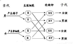 【答案】分析:人的體細(xì)胞內(nèi)的23對(duì)染色體,有一對(duì)染色體與人的性別有關(guān),叫做性染色體;男性的性染色體是XY,女性的性染色體是XX,這樣男性產(chǎn)生的精子就有兩種,一種是含有X染色體的,另一種是含Y染色體的,女性產(chǎn)生的卵細(xì)胞只有一種,是含有X染色體的;如果含X染色體的卵細(xì)胞與含X染色體的精子相融合,那么受精卵的性染色體就是XX,由它發(fā)育成的孩子就是女孩;如果含X染色體的卵細(xì)胞與含Y染色體的精子相融合,那么受精卵的性染色體就是XY,由它發(fā)育成的孩子就是男孩;可見(jiàn),生男生女主要決定于父親的哪一種精子與卵細(xì)胞相融合.