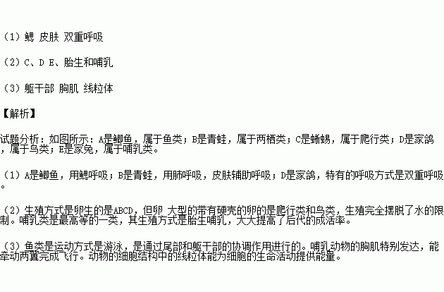(3)從運動來看,A類動物通過尾部和_________的擺動以及鰭的協(xié)調(diào)作用游泳;D類動物的_________非常發(fā)達,能牽動兩翼完成飛行,與此功能相適應(yīng),該器官的細胞中含有大量的能量轉(zhuǎn)換器——_________。