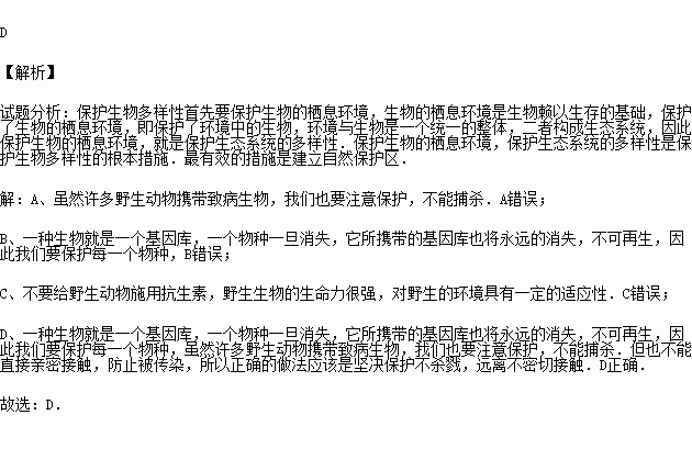 許多科學(xué)家呼吁保護(hù)生物的多樣性,但許多野生動(dòng)物攜帶有許多致病生物,你覺得應(yīng)該( )