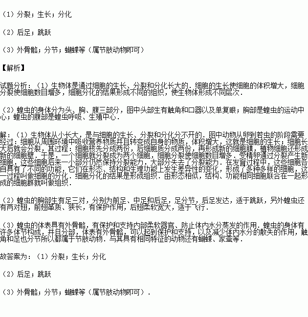 (1)圖中動(dòng)物從卵到若蟲的階段需要經(jīng)過:細(xì)胞的 和細(xì)胞的 過程使其細(xì)胞的數(shù)量和體積增加,再經(jīng)細(xì)胞的 形成不同組織.