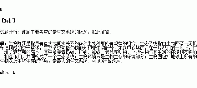 在一片濕潤的土地上,有一堆長滿苔蘚的腐木,其中聚集著螞蟻、蚯蚓、蜘蛛、老鼠等動物.這些生物與其生活的環(huán)境相互影響、相互作用,共同構(gòu)成了一個( )