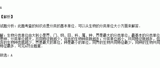 在界、門(mén)、綱、目、科、屬、種的七個(gè)等級(jí)中,生物共同特征最少的等級(jí)和最多的等級(jí)分別是( )