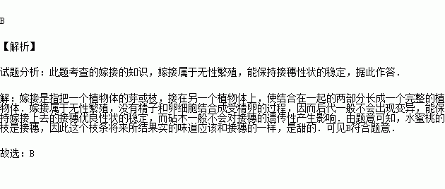 (2015•玉溪模擬)水蜜桃味甜,毛桃味酸,現(xiàn)將水蜜桃(接穗)接到毛桃(砧木)上,成活后,結出的成熟果實,其味是( )