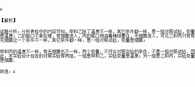 為了探究食品腐敗的原因和細(xì)菌生存的條件,某生物小組取經(jīng)過消毒的甲、乙、丙三個(gè)相同錐形瓶,按下表要求進(jìn)行了實(shí)驗(yàn)設(shè)計(jì):