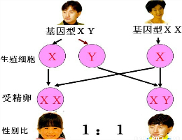 B、人的性別由性染色體決定,男性的性染色體是XY,女性的性染色體是XX;在產(chǎn)生生殖細(xì)胞時,男性產(chǎn)生兩種類型的精子:含有X染色體的和含有Y染色體的,女性只產(chǎn)生一種含有X染色體的卵細(xì)胞;在形成受精卵時,如果含X染色體的卵細(xì)胞與含X染色體的精子相融合,那么受精卵的性染色體就是XX,由它發(fā)育成的孩子就是女孩;如果含X染色體的卵細(xì)胞與含Y染色體的精子相融合,那么受精卵的性染色體就是XY,由它發(fā)育成的孩子就是男孩;因此在體細(xì)胞和生殖細(xì)胞中都有染色體.故不符合題意;