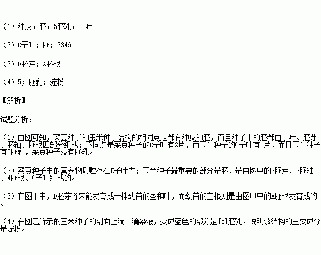(4)在圖乙所示的玉米種子的剖面上滴一滴染液,變成藍(lán)色的部分是[ ] ,說(shuō)明該結(jié)構(gòu)的主要成分是 。