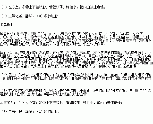(1)甲圖中A、B、C、D表示心臟的四個腔,①②③④⑤表示血管,A是 .與心房相連的血管中,[ ] 內(nèi)血液中含氧量較少,該血管的結(jié)構(gòu)特點是 .