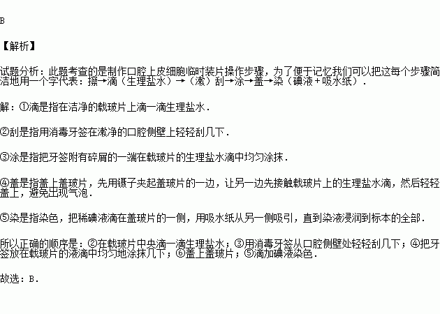 制作人體口腔上皮細(xì)胞臨時裝片的正確順序是( )