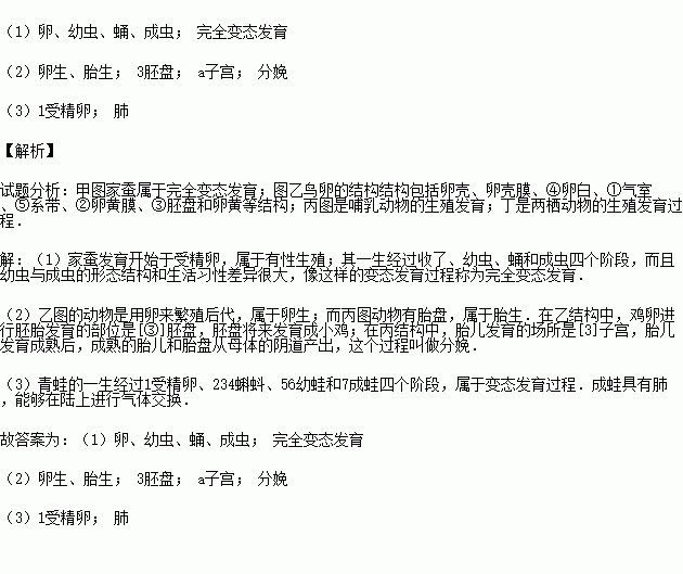 (2)乙、丙兩圖所示結(jié)構(gòu)反應(yīng)了兩種生殖方式,分別是 ;在乙結(jié)構(gòu)中,雞卵進(jìn)行胚胎發(fā)育的部位是[ ] ;在丙結(jié)構(gòu)中,胎兒發(fā)育的場所是[ ] ;胎兒發(fā)育成熟后,成熟的胎兒和胎盤從母體的陰道產(chǎn)出,這個(gè)過程叫做 .