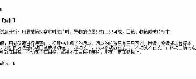用顯微鏡觀察臨時裝片時,發(fā)現(xiàn)視野中有一污點,先轉(zhuǎn)動目鏡,又移動玻片標本,污點都不動,說明污點在( )