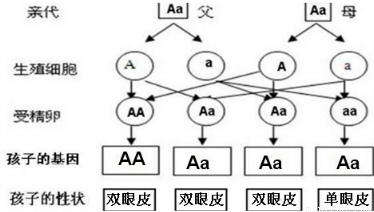 試題分析:夫婦都是雙眼皮,且基因均為Aa,說明夫婦雙方都含有一個控制單眼皮的隱性基因a,單眼皮孩子的基因造成是aa,由夫婦雙方各提供一個,如圖所示: