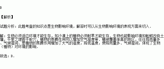 (2014•湘潭)植被覆蓋率高的地區(qū),往往降雨量多、氣候濕潤,這種現(xiàn)象說明( )