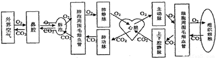 ,請用箭頭在如圖中畫出氧氣在人體內(nèi)的旅行線路.氧氣消耗時(shí)產(chǎn)生了
