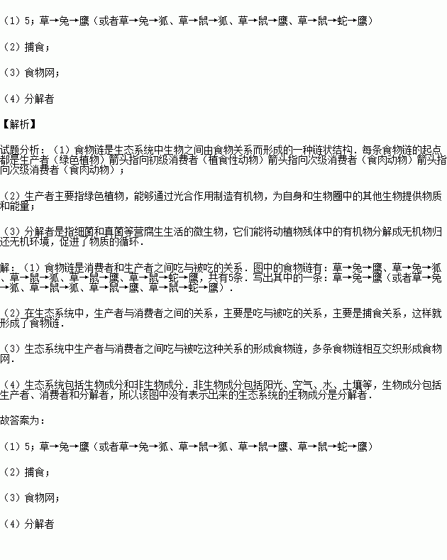 (1)圖中共有 條食物鏈,請寫出其中的一條: .