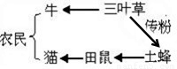 達(dá)爾文曾經(jīng)這樣描述生物之間的關(guān)系,“牛喜歡吃三葉草,三葉草結(jié)子要靠土蜂傳粉;田鼠吃土蜂的蜜和幼蟲,搗毀土蜂的巢;貓捕食田鼠.因此養(yǎng)牛的農(nóng)民愛養(yǎng)貓.”