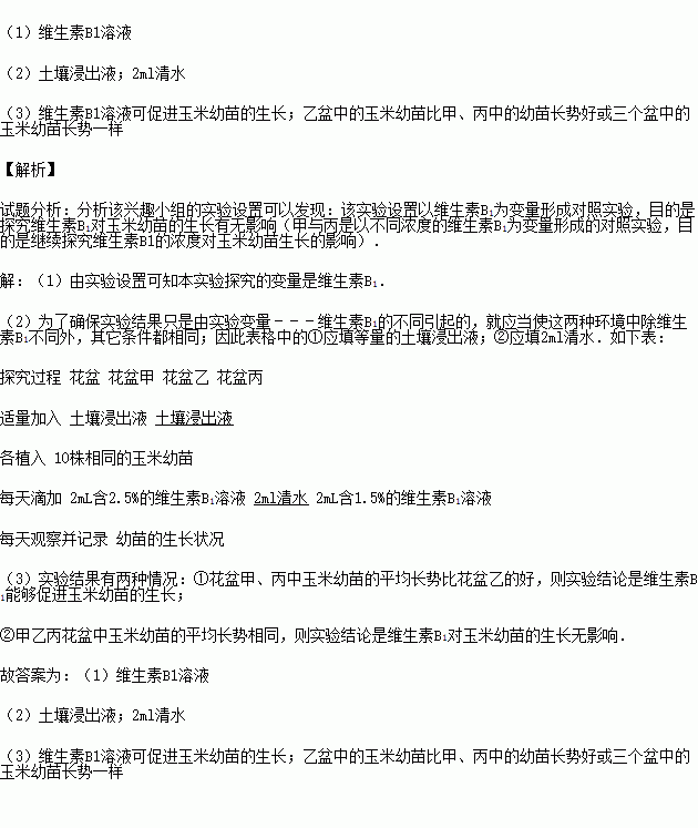 第二十九屆吉林省青少年科技創(chuàng)新大賽中,孫寧岳同學(xué)憑借“維生素B1對玉米幼苗的生長有影響”等研究成果獲得金獎(jiǎng).某興趣小組為驗(yàn)證該研究成果,制定了實(shí)驗(yàn)方案,探究過程如表所示(實(shí)驗(yàn)的裝置相同).