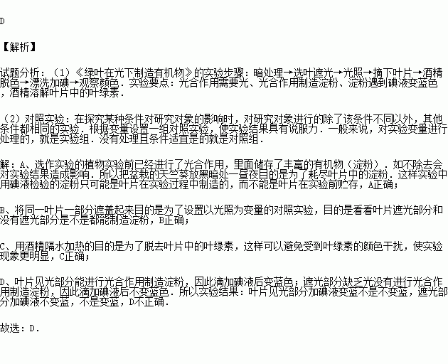 D.實驗結(jié)果:葉片見光部分加碘液不變藍(lán),遮光部分加碘液變藍(lán)