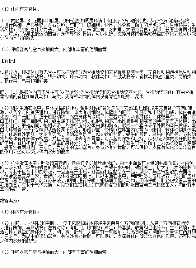 (2)海葵屬于腔腸動物,體壁由 組成,身體呈輻射對稱的意義是 ;渦蟲屬于 ,身體呈 ;蛔蟲消化管結(jié)構(gòu)與渦蟲相比,其特點(diǎn)是 ;蚯蚓環(huán)帶上的 能分泌蛋白質(zhì)和黏液;蟶身體柔軟,以水中的微小生物為食,運(yùn)動器官為 ,其貝殼的形成與 有關(guān);蝗蟲、蜘蛛、梭子蟹的共同特征是身體分部, ,體表有外骨骼;節(jié)肢動物不同的身體分布與它的 和 是相適應(yīng)的;判斷是否是昆蟲最主要的特征是 .