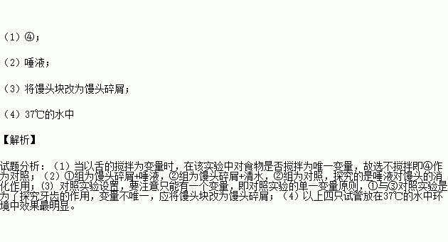 某中學(xué)的生物實驗小組在探究“饅頭在口腔中的變化”時,進行了以下四種處理(見下表),其中試①的處理模擬了口腔中牙齒.舌.唾液的作用,試管②③④的處理都是①的對照實驗,請結(jié)合所學(xué)知識回答: