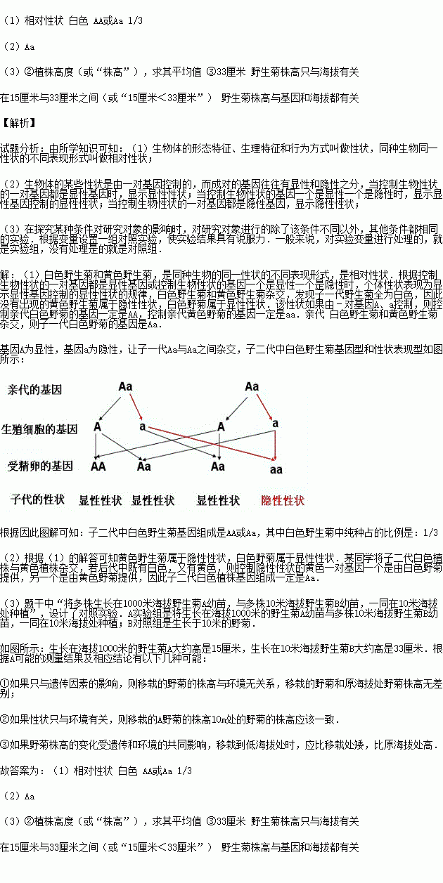 (1)白色和黃色屬于一對 ,其中 是顯性性狀,讓子一代之間雜交,子二代中白色野生菊基因組成是 ,在白色野生菊中純種占的比例是 .