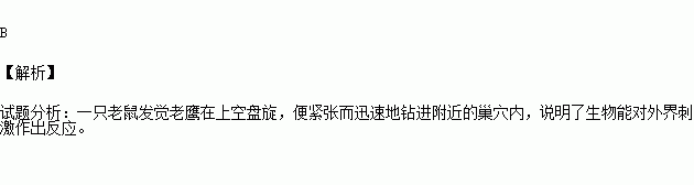 草原上,一只老鼠發(fā)覺(jué)老鷹在上空盤旋,便緊張而迅速地鉆進(jìn)附近的巢穴內(nèi)。老鼠的這種行為體現(xiàn)了生物( )