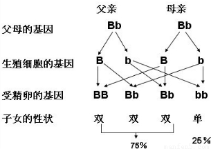 (2)如果顯性基因用B表示,隱性基因用b表示,若第三組中父親為雙眼皮,母親為單眼皮,生了一個(gè)單眼皮的孩子,請(qǐng)寫出雙親的基因組成:______. (3)從第2組數(shù)據(jù)中可以看出,如果父母均為雙眼皮,子女有的是單眼皮,有的是雙眼皮,請(qǐng)寫出雙眼皮子女的基因組成:______. (4)如果第1組某家庭的單眼皮母親做了雙眼皮手術(shù),那么她能生出雙眼皮的孩子嗎?為什么?______,______. 查看答案和解析>> 同步練習(xí)冊(cè)答案 國際學(xué)校優(yōu)選 - 練習(xí)冊(cè)列表 - 試題列表 湖北省互聯(lián)網(wǎng)違法和不良信息舉報(bào)平臺(tái) | 網(wǎng)上有害信息舉報(bào)專區(qū) | 電信詐騙舉報(bào)專區(qū) | 涉歷史虛無主義有害信息舉報(bào)專區(qū) | 涉企侵權(quán)舉報(bào)專區(qū) 違法和不良信息舉報(bào)電話:027-86699610 舉報(bào)郵箱:58377363@163.com版權(quán)聲明:本站所有文章,圖片來源于網(wǎng)絡(luò),著作權(quán)及版權(quán)歸原作者所有,轉(zhuǎn)載無意侵犯版權(quán),如有侵權(quán),請(qǐng)作者速來函告知,我們將盡快處理,聯(lián)系qq:3310059649。 ICP備案序號(hào): 滬ICP備07509807號(hào)-10 鄂公網(wǎng)安備42018502000812號(hào) | ||||||||||||||||||||||||||||||||||||||||||||||||||||||||||||||||||||||||||||||||||||||||