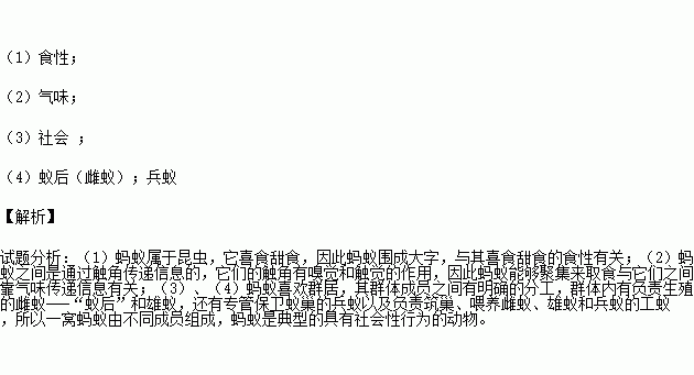 (1)螞蟻能夠按照人的設(shè)計(jì)圍成幾個(gè)大字,這與螞蟻的 有關(guān)。(填“形態(tài)”或“食性”)
