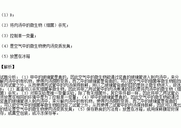 將新鮮的澄清的肉湯等量的放入如圖甲乙兩試管中,然后將兩支試管的肉湯煮沸,放置在溫暖的環(huán)境中,7天后觀察到乙試管中的肉湯依然澄清,甲試管中的肉湯變質(zhì)發(fā)臭,根據(jù)此實驗,完成下列問題: