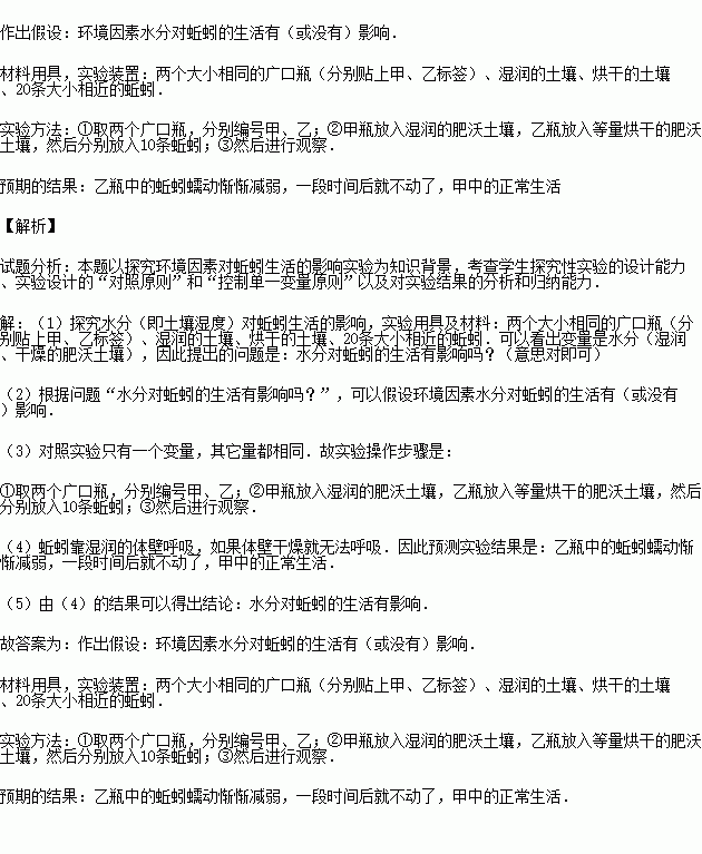 (2015秋•長(zhǎng)沙校級(jí)期中)探究:水分對(duì)蚯蚓生活的影響.請(qǐng)?zhí)岢龊侠淼募僭O(shè),寫出實(shí)驗(yàn)方案(包括:材料用具,實(shí)驗(yàn)裝置,方法步驟)和預(yù)期的結(jié)果.