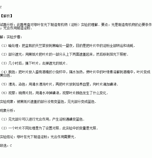 (2014•蓬江區(qū)二模)如圖表示德國科學家薩克斯的實驗.把綠色的葉片放在暗處幾小時后,再把葉片的一部分遮光,其它部分曝光.一段時間后,經(jīng)脫色、漂洗再用碘液處理,結(jié)果遮光部分不變藍,曝光部分變藍.本實驗說明( )