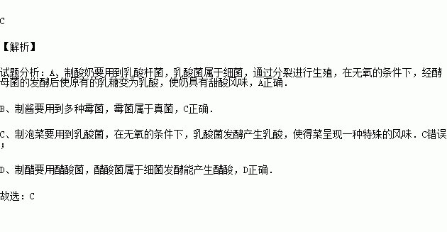 C.利用酵母菌制作酸菜 D.利用醋酸菌制醋