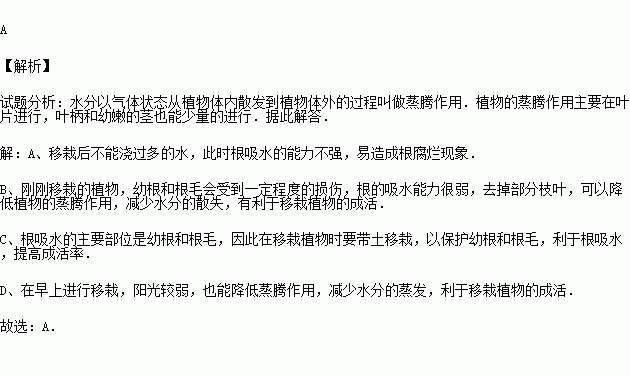 王叔叔想在自家院子種一棵大樹,要求帶冠移植.下面是某同學對王叔叔提供的建議,其中對移栽的成活無益的是( )