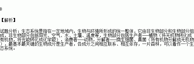 在一片森林中,有土壤、水分、陽光、空氣,生活著各種植物、動物、微生物,它們共同組成 ( )